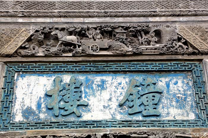 钟楼上方。水磨青砖上镂空雕刻的马匹和人物活灵活现。