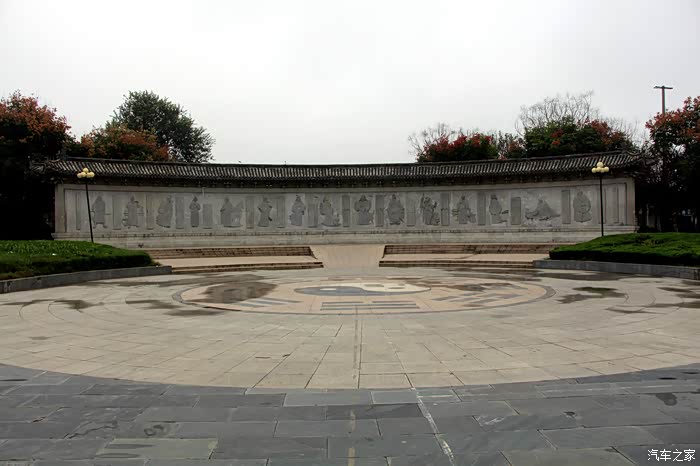 花戏楼前偌大的广场。照壁上雕刻有亳州的历史人物。其中有:曹操、曹丕、曹植、华陀、老子、庄子。单单这几人无疑已是重量级人物了。