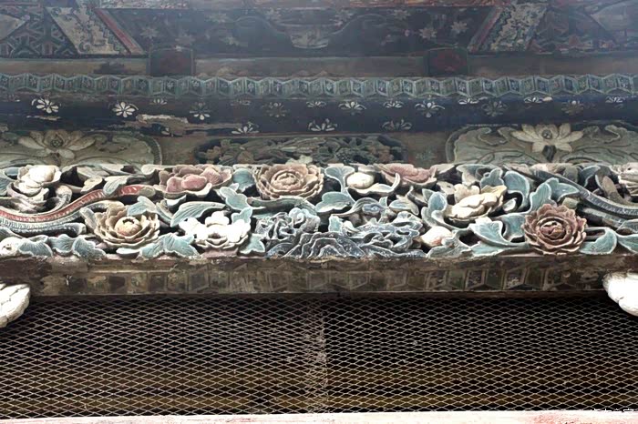 栋梁上镂刻雕刻的人物伴有彩绘,在讲诉一场远古争斗,一场搏杀。