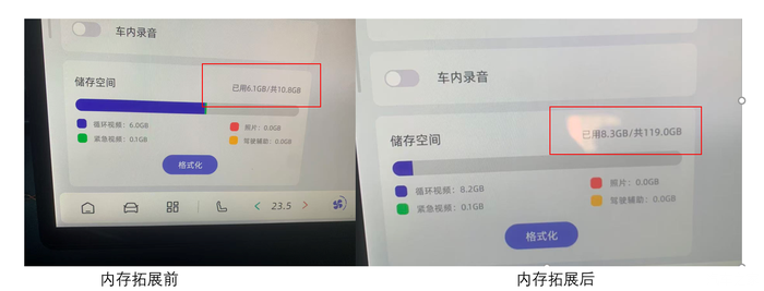 最让我满意的更新是行车记录仪支持内存扩展。此前,原车仅内置8GB存储,视频录制半小时左右就可能覆盖旧文件,常因存储空间不足而无法保存关键记录。现在,系统支持使用Class 10以上的高速TF卡,最高可扩展至128GB。实测在1080P画质下,能存储超过24小时的行车视频,彻底解决了存储焦虑,为潜在的行车纠纷提供了有力保障。卡槽位于电门踏板右侧,自行安装非常方便。