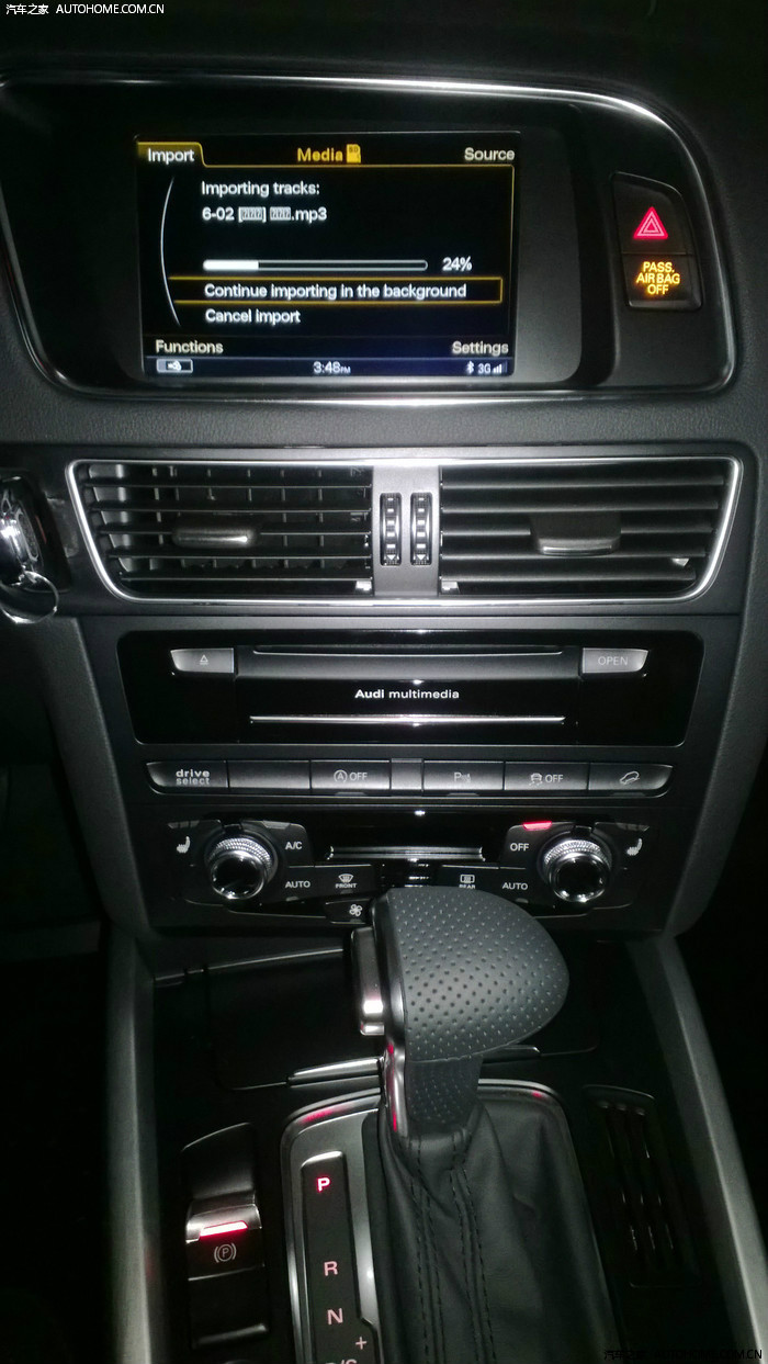 Audi MMI界面,内置硬盘,正在从SD卡上复制MP3。我发现直接用SD卡播放音乐时间久了卡会发烫,所以还是复制到硬盘上去好。可惜这系统居然不能显示中文!