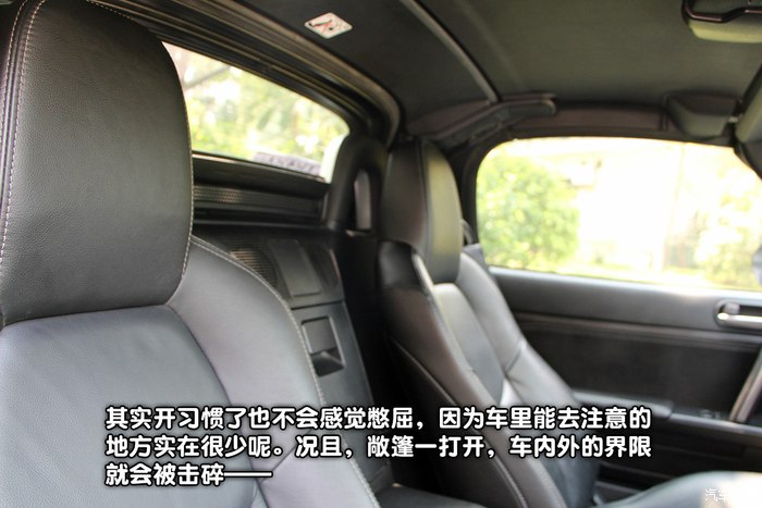 大大的小玩具,没什么空间可言,但是能保证两个人坐得不憋屈。舒适性能加分的也就只有座椅加热了。空调比较基础,转盘和刻度不太能精确地设定温度,得习惯。原厂横滨ADVAN轮胎比较运动(听说新款已经用普利司通搏天族了,大概会更适合国情?),胎噪和路感清晰,加上运动型的悬挂…… 路破一点,你就不想开太久了。对,颠而且胎噪大。所以表现最好自然还是在柏油路上,水泥嘛勉勉强强马马虎虎。