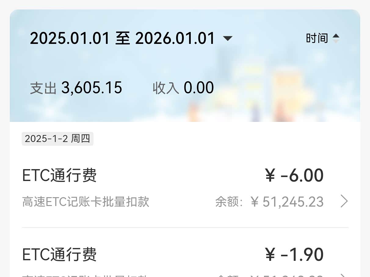 因为通勤和出游都离不开高速,高速费也成了用车成本的“大头”之一。我提车后就安装了ETC助手,直接绑定银行卡扣费,能清晰查到每年的高速费用,但看不到对应的高速里程,所以只能按行业平均0.5元/公里反推,3605.15元÷0.5元/公里=7202.3公里,和我估算的7200公里基本一致。