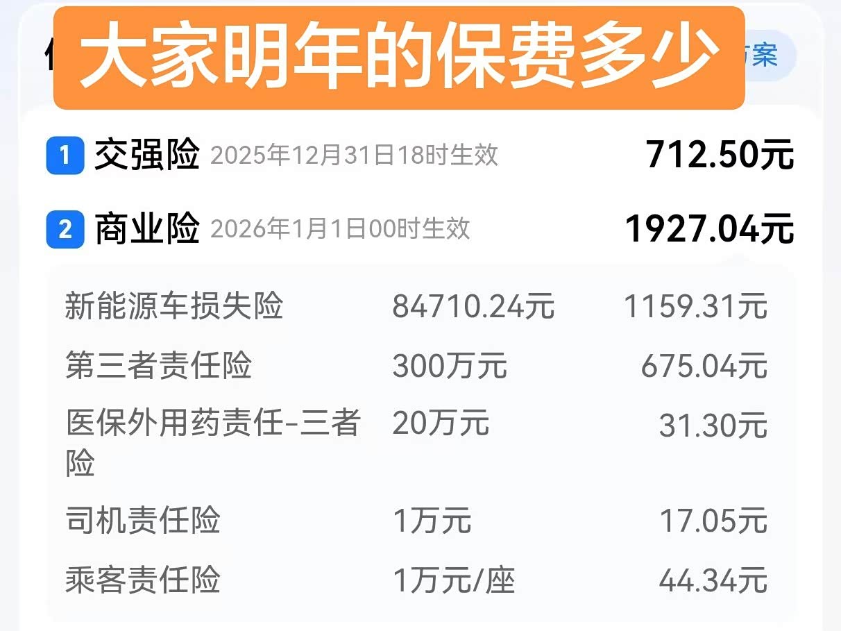 - 交强险:712.5元(首年950元,第二年因为没出险,按费率下浮10%,再加上新能源汽车的交强险优惠,最终712.5元);