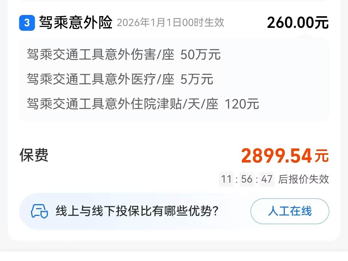 - 驾乘险:260元(每人保额10万,5座合计50万保额,主要是为了覆盖车内人员的意外风险)。