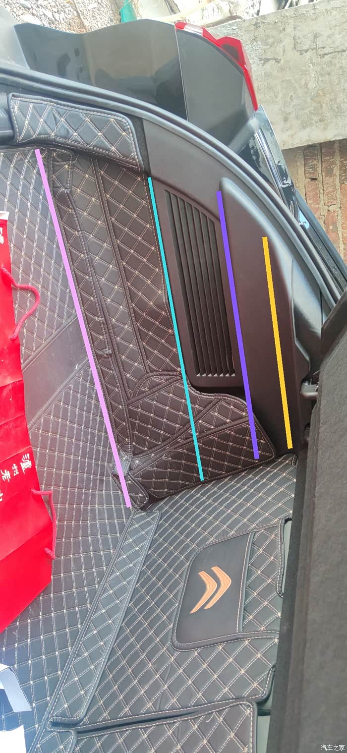 凡尔赛C5X的后备箱,是一个不规则的类似长方体的空间,所以需要测量不同的数据,后备厢底部深度95CM(粉),往上一节深度是78CM(青蓝)再上点是深度是66CM(紫),顶部是50CM(黄),最窄宽度是87*50CM(红),往下是100*45CM(蓝),最宽量得106*36CM(绿)。由此得出。凡尔赛C5X后备厢可以装载最大的物品尺寸分别为87*50*50CM,100*45*66CM,106*36*80CM。