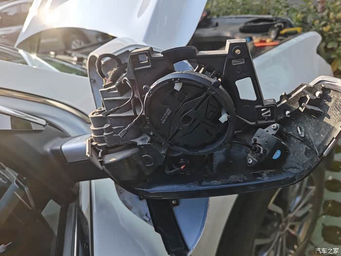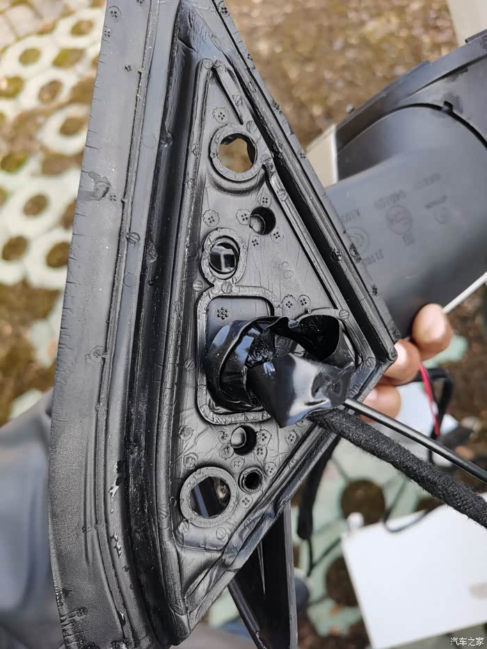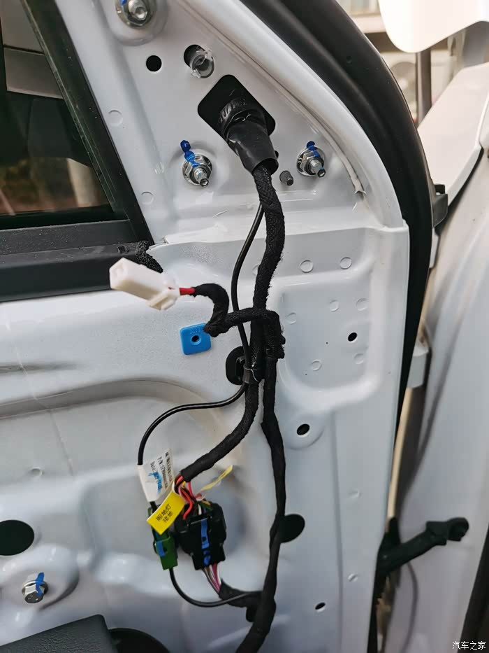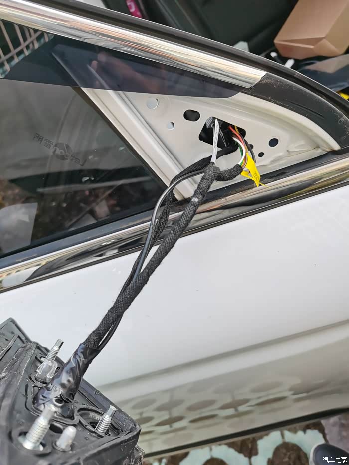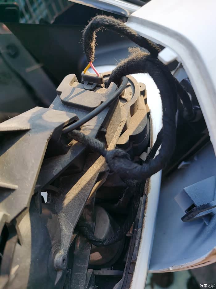 这里也要注意,后视镜连接器没有到镜片的盲区监测两芯线,需要另加,整套盲区监测系统中有附带的线束(从后视镜到副驾中控下护板那),长度足够,我将其截断后重做端子改到DR08d、DR18d两个后视镜连接器里了,这样就避免了从两个门板穿线到副驾的困难,从后视镜转轴穿线可以利用摄像头的线束作为引线,这一步穿线很简单,很快就能完成!