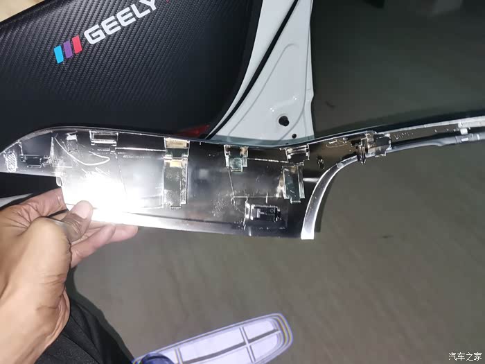 安装雷达模块支架,这里要说明下的是,可能车子出厂批次不同,我车后杠安雷达模块那个地方并无像教程描叙的有预留接口,没办法只能自己上电钻打孔了,当然这里还发现有个意外之喜:后杠防撞梁并不是传言中的塑料模块,至少可以确定是金属的,厚度也还行,可能是骂吉利的车友太多,不得不解决