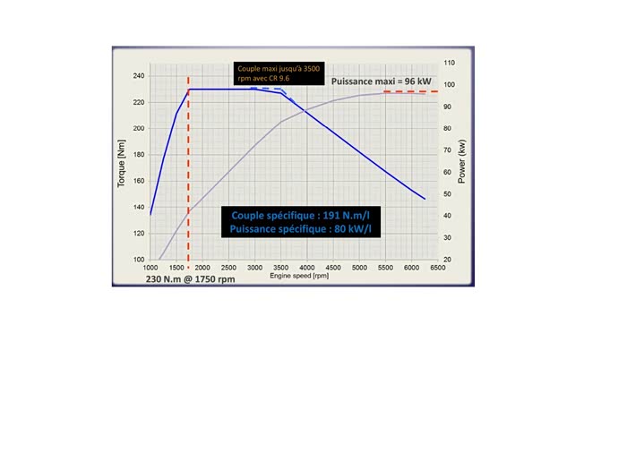 在1000转(RPM)时,涡轮就已经介入,这时候能达到的扭矩为大约130牛米(Nm),在2200转时就可以达到最大扭矩230Nm.说明这是一个低转速就可以达到大扭矩的发动机。这对于起步和加速是有利的,增加了驾驶乐趣。随后这个最大扭矩一直持续到3500转。