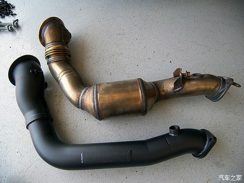 N54的主三元催化紧接着涡轮增压器后面 为了让涡轮可以转的更快 必须要拿掉三元催化来增加尾气流速 三元催化很贵 舍不得直接掏空 所以选用了CP-E的两根管子 不锈钢材质