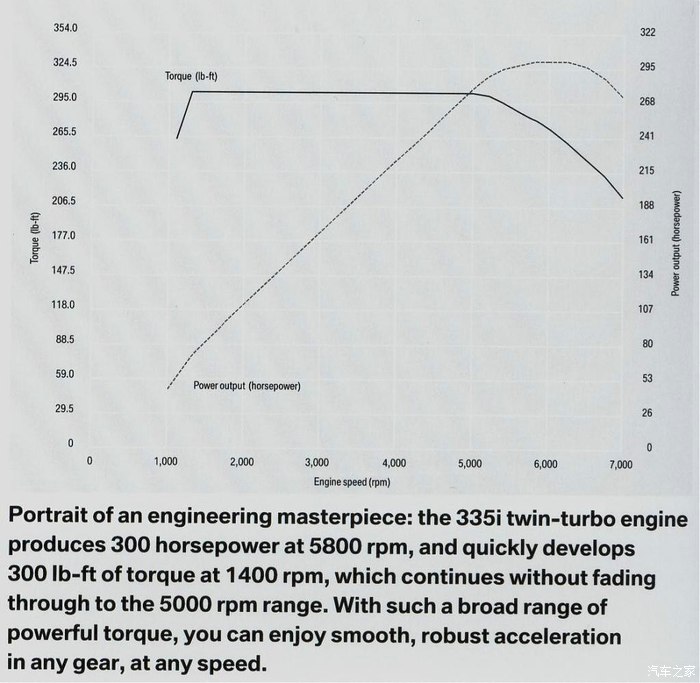 可是当你看到马力曲线图的时候就会明白这台发动机的最大扭力在1500转就达到峰值 开起来颇有带电机辅助的电动跑车的感觉 因为335i给你的推背感在1500-5000转之间是相同的 在高速超车用6档也是颇为轻松