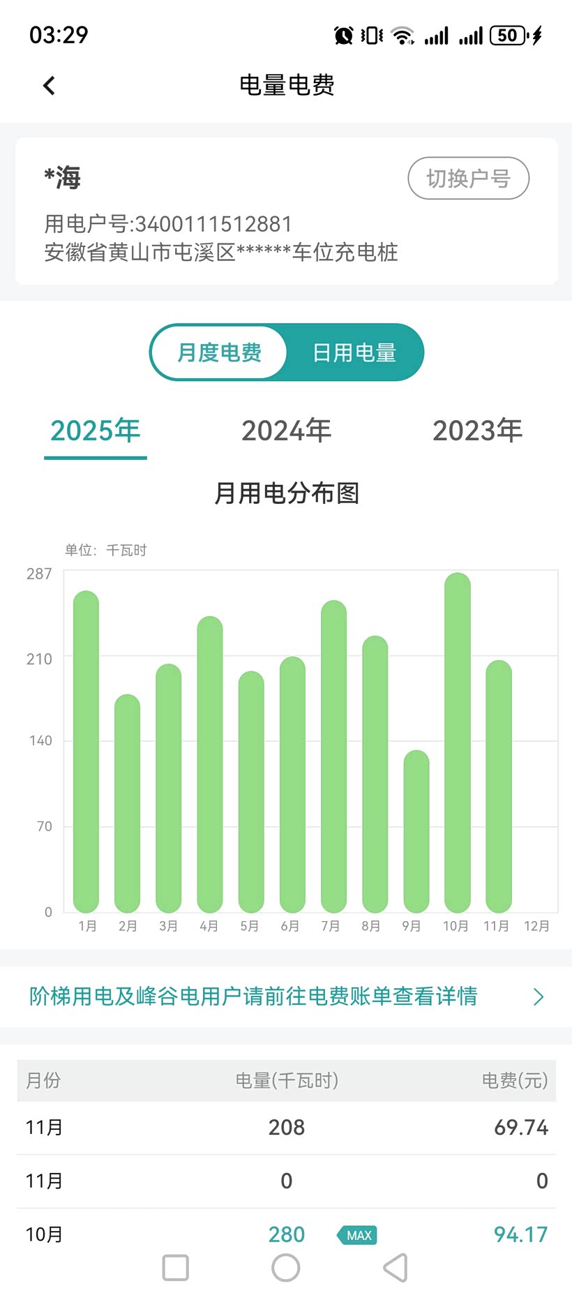 先上硬数据:保险费3580多元,算是固定的大头;家充桩太香了,全年充电费仅860元,一公里不到一毛钱,外出游玩还可以用v豆兑换电卡,一分钱没额外花;小区停车费每月150元,一年下来1800元;洗车更省,200元办的洗车卡几乎没动,全靠4S店免费洗车福利。唯一的意外支出是换轮胎,今年去安吉返程时胎压监测报警,检查发现轮胎大口子漏气,果断换了两条胎花了1500元。其他停车费几乎可以忽略不计,景德镇两日游才花15元,黄山周边露营、短途自驾全是免费停车,这笔账算下来真的太香了。
