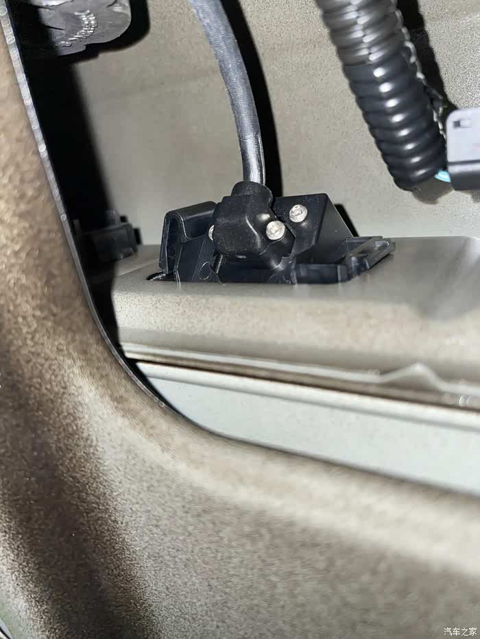 第三步,安装更换后的摄像头,按拆除方法原路装回即可,连接接插件线束,新购买的接插件线束连接在后部行李箱隔物板位置的喇叭处,相当于是中间做了一个转接,引出来2个头,一个接喇叭,一个接倒车影像,可以防止出现挂挡瞬间蓝屏问题。