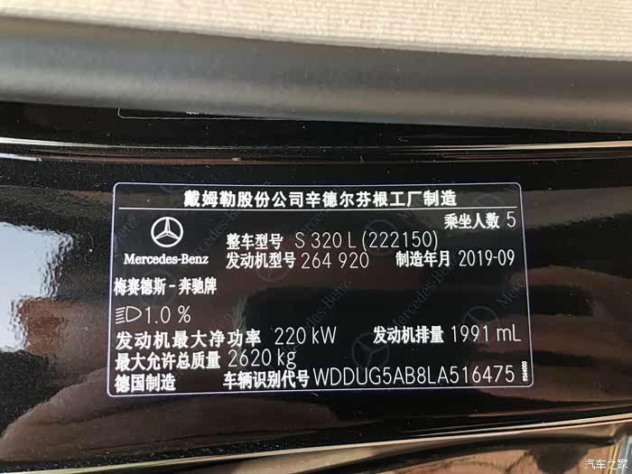 XT5开了2年多的时间后,感觉随着自己事业的发展,还是缺台够规格的商务轿车,开始物色我的第四台车--D级车。在奔驰S级和宝马7系之间考虑了蛮久,最后还是感觉黑色的奔驰S级还是最经典的商务轿车,大气、稳重、久看不厌!经过半年的慎重考虑后,于2019年6月15日去南昌迎星奔驰4S(利星行旗下)订了一台黑外米内的S320L,选装原厂配置有:带记忆功能的后排电动可调座椅、后排座椅通风。因选装了原厂配置,所以足足等车等了6个多月,2019年12月底车才到4S店,2020年1月中旬才完成上牌,2020年1月20日把它提回家。