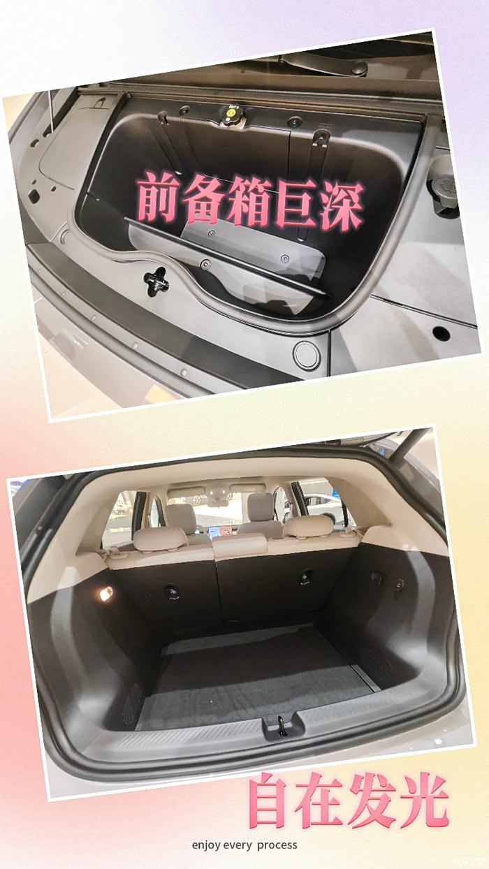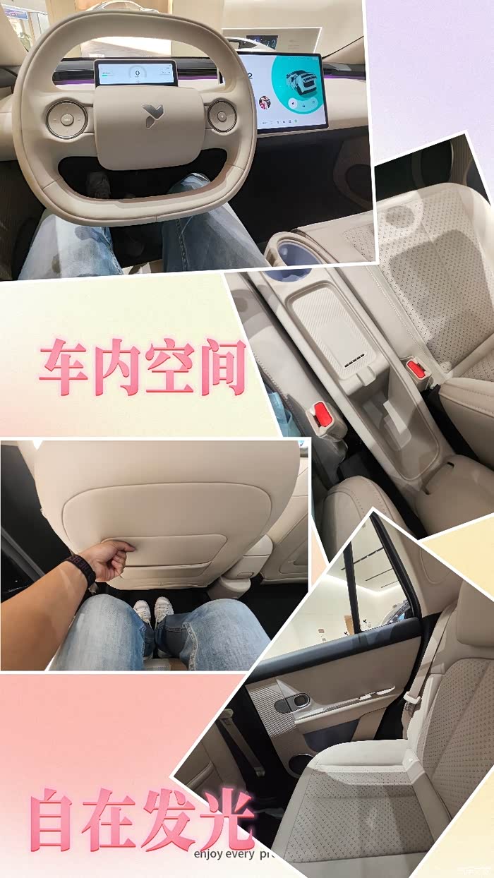 后排进去体验了,我身高172cm,坐进去腿部距离前排还有一拳半的空间,头部也不压抑。讲真,这真的是A0级小车吗?空间表现完全超出预期!储物空间更是惊喜,前备箱、后备箱、座椅下方……各种隐藏式储物格,感觉设计师把能利用的地方全用上了,日常家用完全够用。