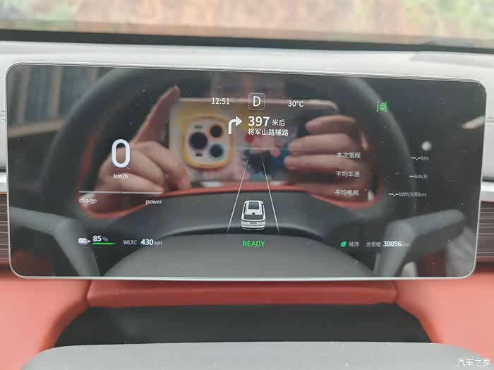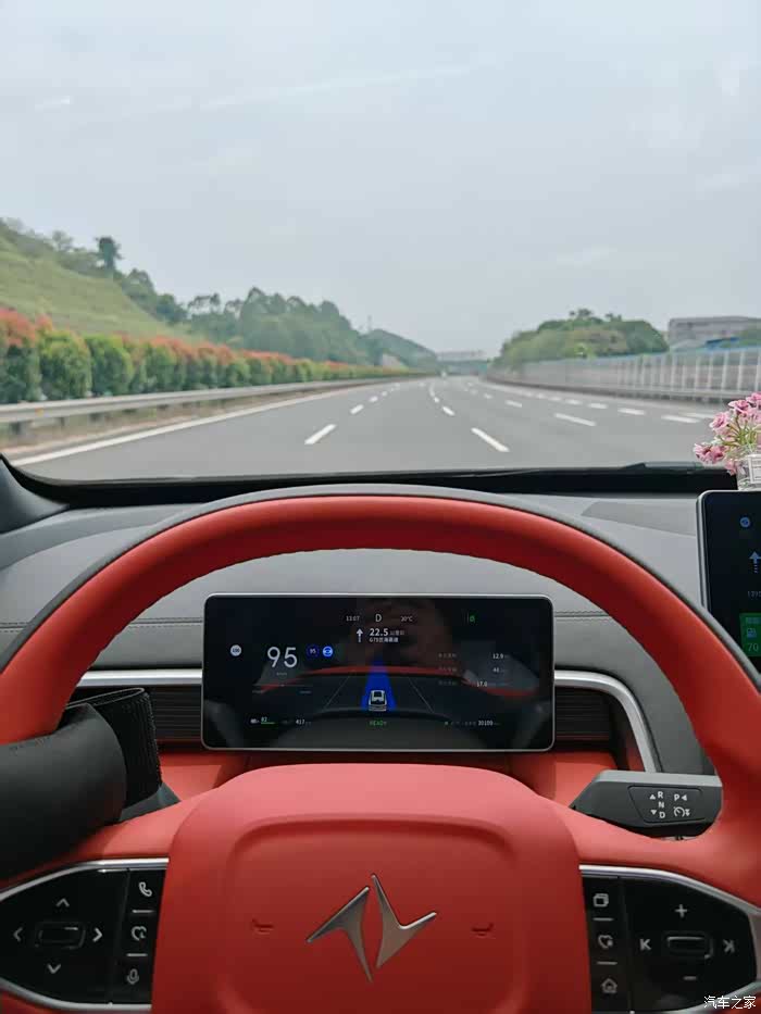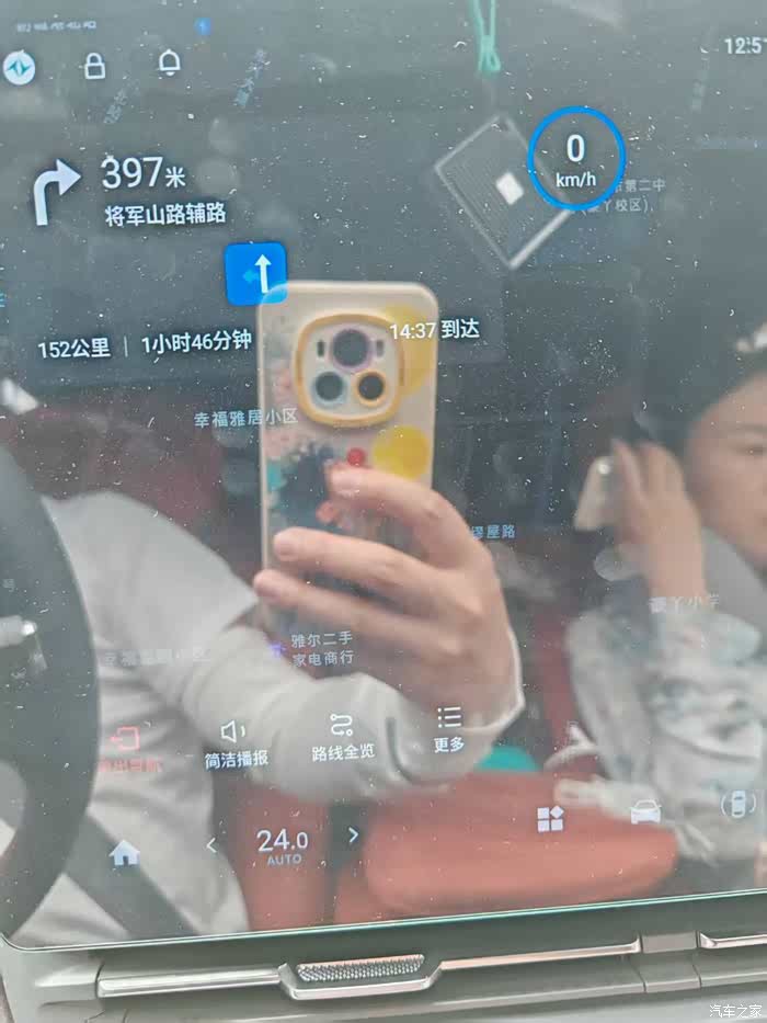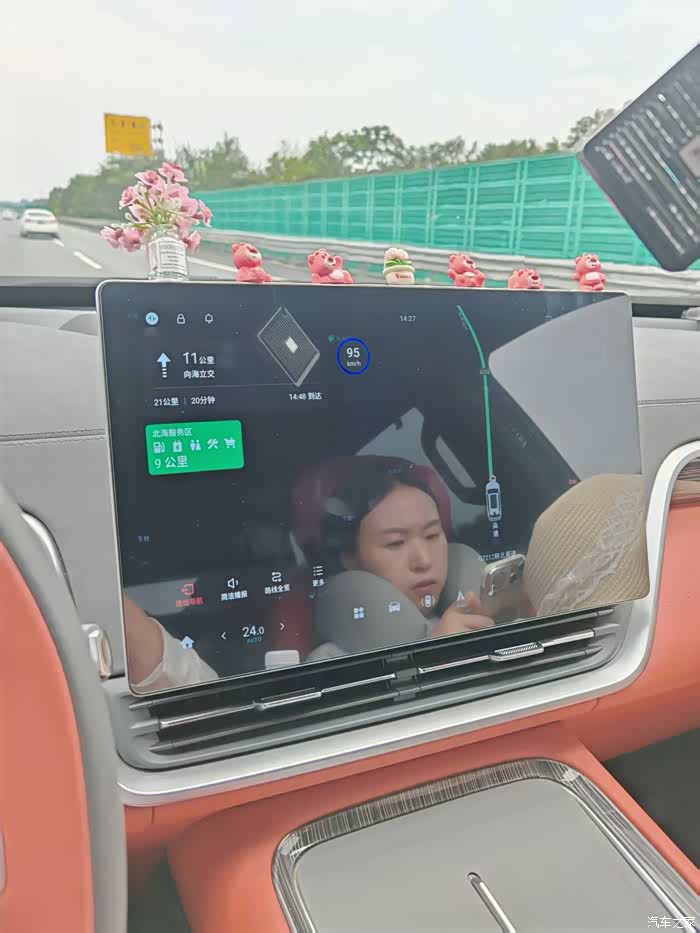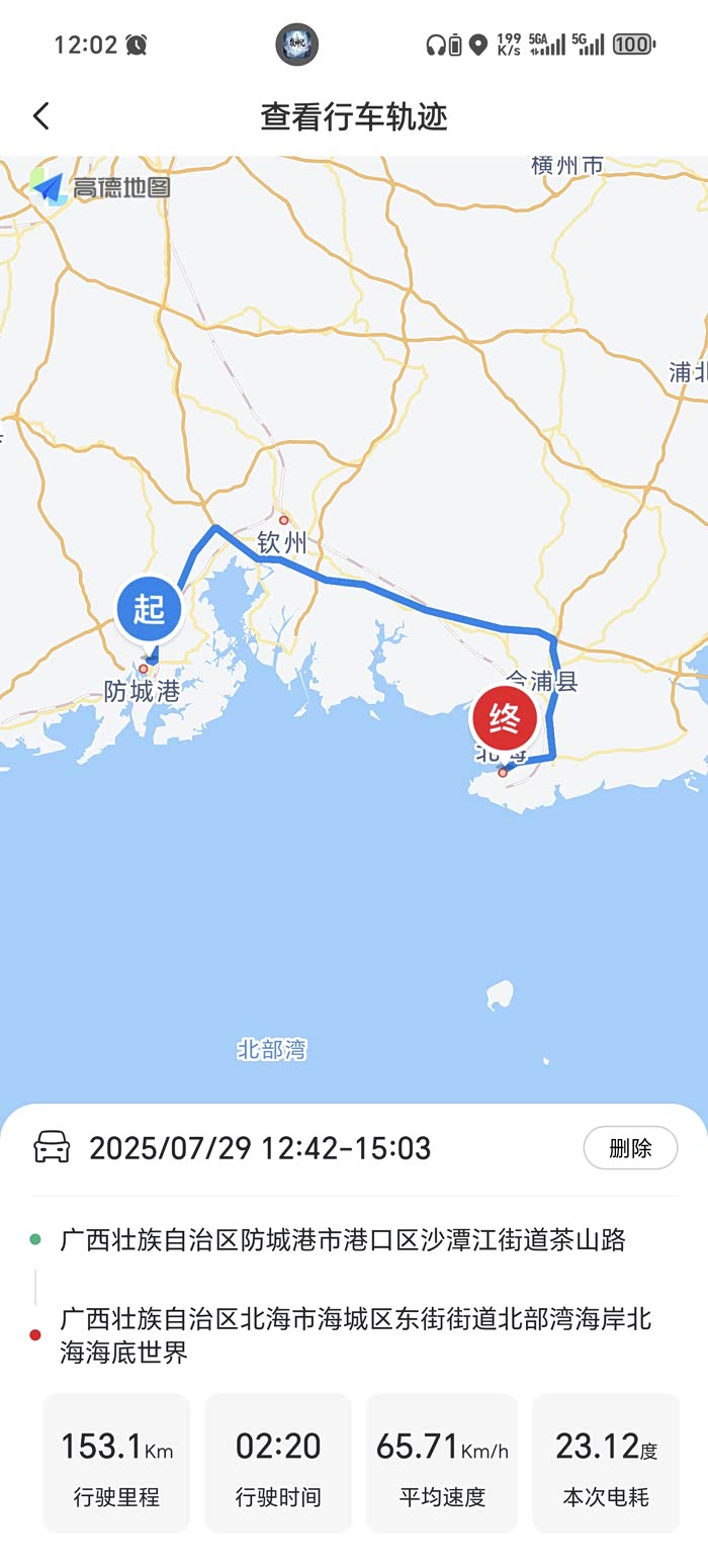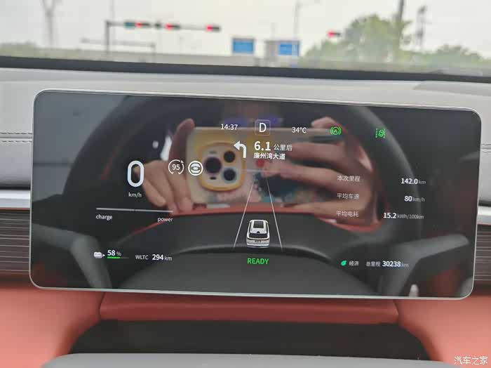 小计里程153km,耗时2小时20分,平均时速65.7km/h,平均能耗15.2kwh/100km,电量消耗15.2*1.53=23.3电。出发时剩余电量85%电量、wltc续航430公里,到达时剩余电量57%电、wltc续航284公里。电量消耗85-56=29%,82.2*0.29=23.8度电。空调、车载冰箱、娱乐屏等非驱动消耗的电量23.8-23.3=0.5度电。wltc续航消耗430-284=146公里,实际路程153公里,达成率153÷146=105%,反向虚标。