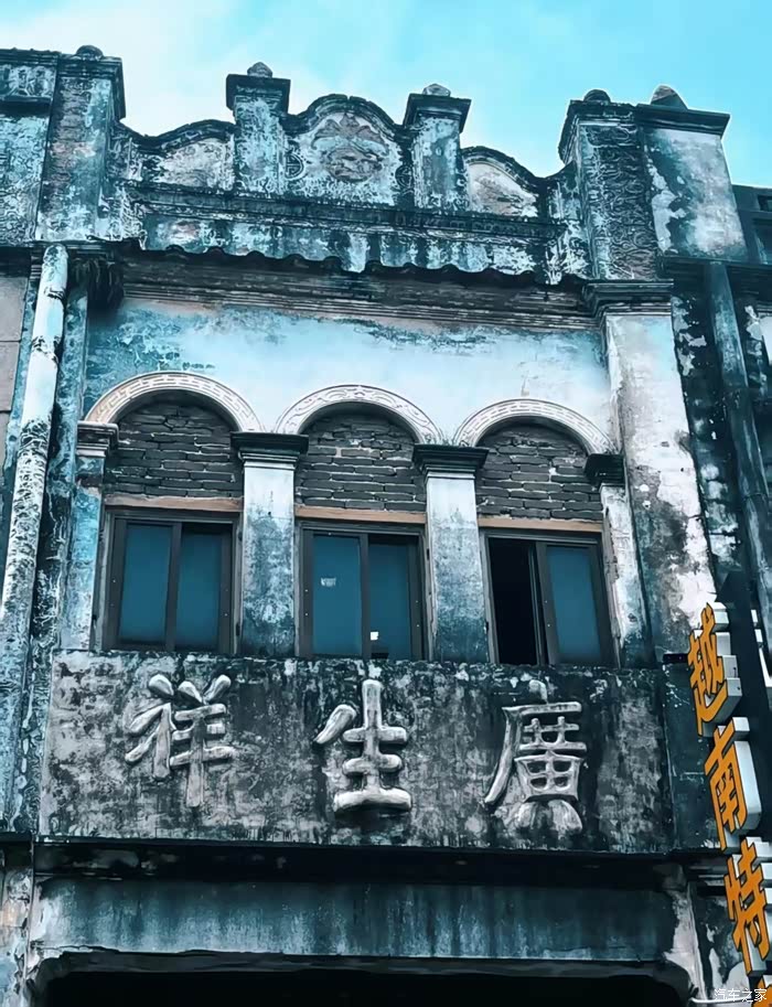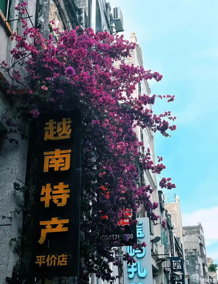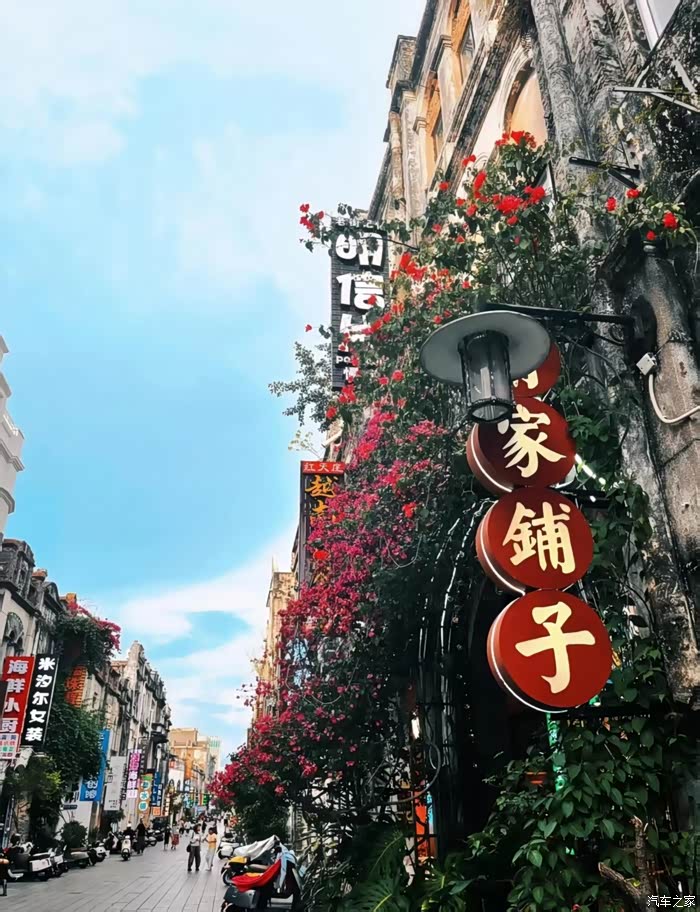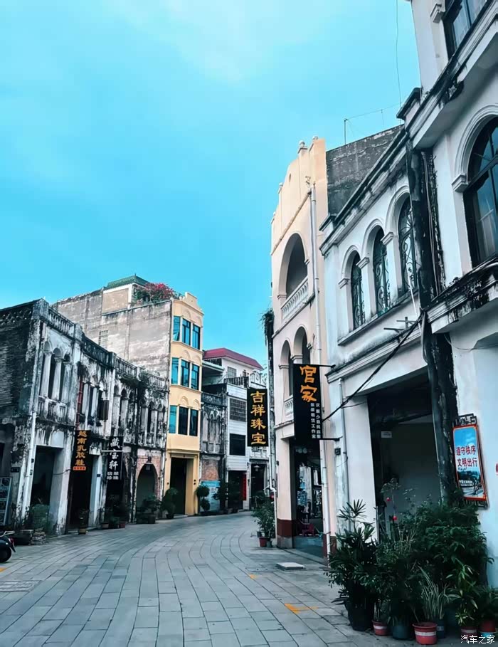 老街的建筑是中西合璧的风格,粗大的罗马柱、岭南风的骑楼,混搭得意外和谐。骑楼街一路过去基本看到的都是斑驳的墙面、雕花的窗拱,但是有些楼上的三角梅开得很不错,红红火火的,衬着灰扑扑的老墙,反差感很强。