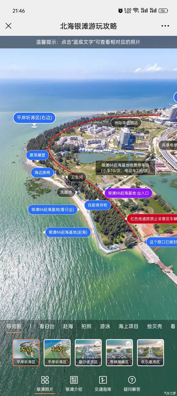 不绕路入口④导航66赶海基地,小汽车也可以停,但是需要付停车费,66赶海基地是银滩的最东边,平时游客也会相对较少。