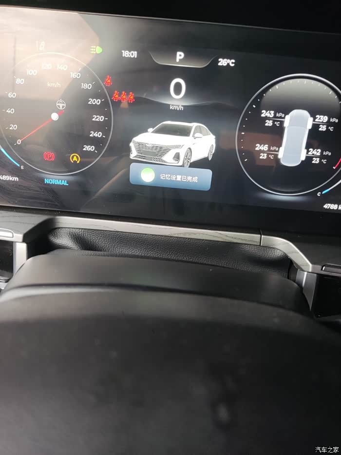 3.长按按键3秒后主驾驶屏幕会弹出“记忆设置完成”的字样,就表示座椅记忆加后视镜记忆和倒车后视镜记忆保存完毕。