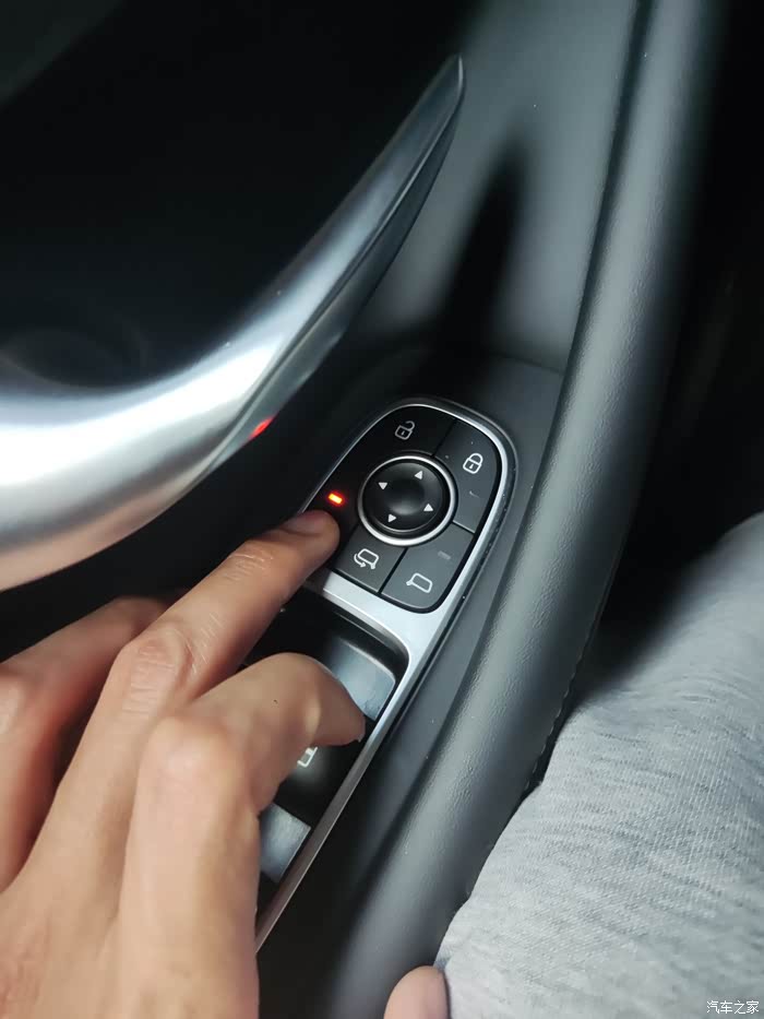 1.按下主驾驶位左手边的后视镜调节按键,如下图所示,按下后,会长亮红灯,此时可以调节后视镜位置,中间圆形四个方向键可以调节后视镜方向和位置。