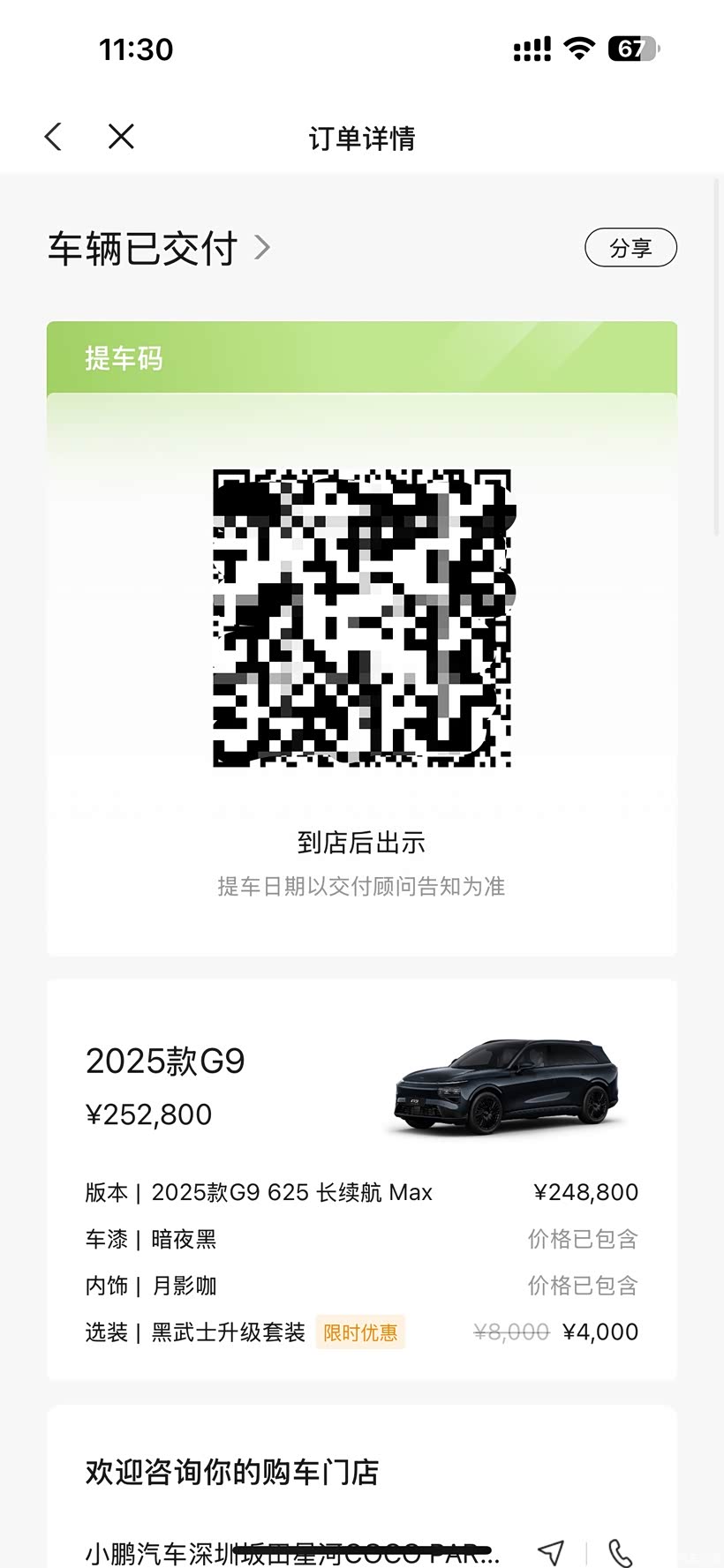 我是9月2日下订的,但第二天匆忙去出差大半个月只能约10月2日取车。车刚回到网点就偶遇台风,小鹏经理不仅帮我提前把车停进展厅保护好,还一直耐心教我怎么申请购车补贴、填写资料、保险购买等等。交付日小鹏工作人员不仅提前安排好仪式洗好车还给我和男友拍照,办完所有手续后还细致地为我们讲解演示了所有功能,服务专业又贴心。