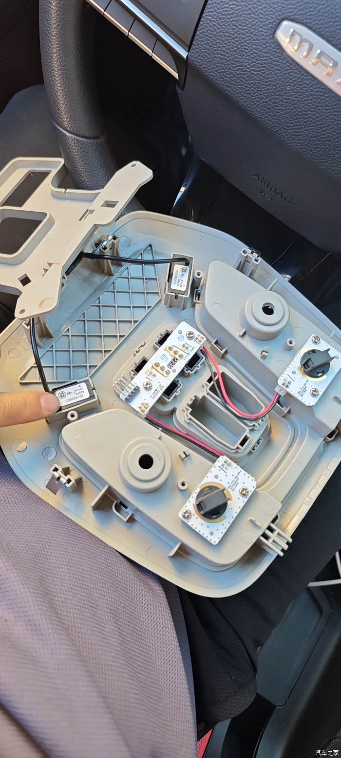 先说前阅读灯,小一字螺丝刀撬开外罩,然后2颗螺丝卸下来,再用撬棒沿外边撬,就把整个前灯组件撬下来了,后面2组线,一组灯的,