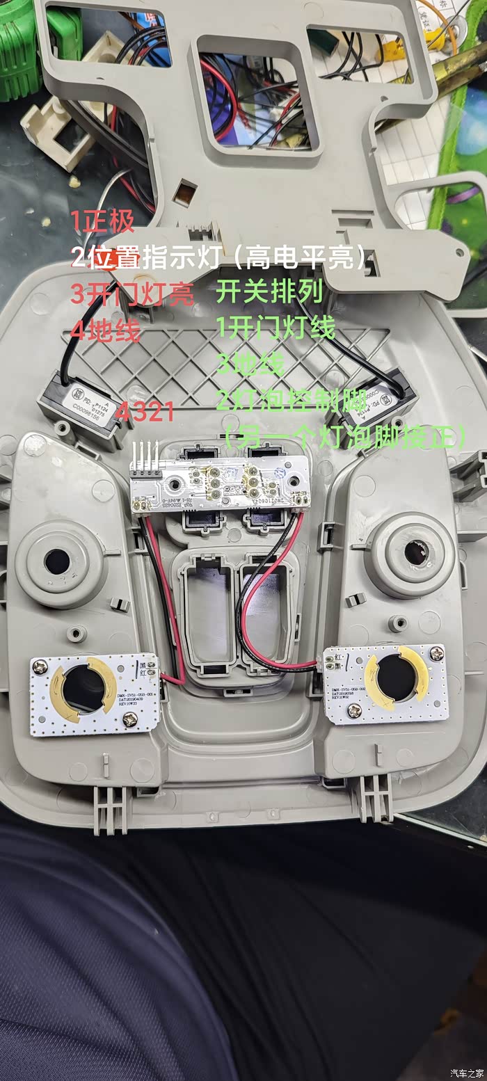 后箱灯是给它改到顶上了,因为我装行李架把顶棚拆了,灯线要是不拆顶的话可以把门封条拆下来,把原来灯的那两条线引上去,两条灯线我是焊接到灯座上的