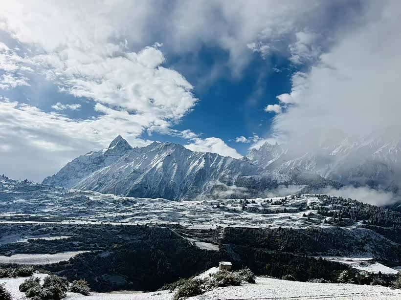 从酒店出来上了县道发现有些不对劲儿,地面上全是水,湿漉漉的。这节气应该不会有人往地上洒水除尘吧?难不成是夜里下雪了?我这还琢磨呢,抬头一看远处山上白茫茫一片,感觉不妙,这夏贡拉山保不齐是没法去了。