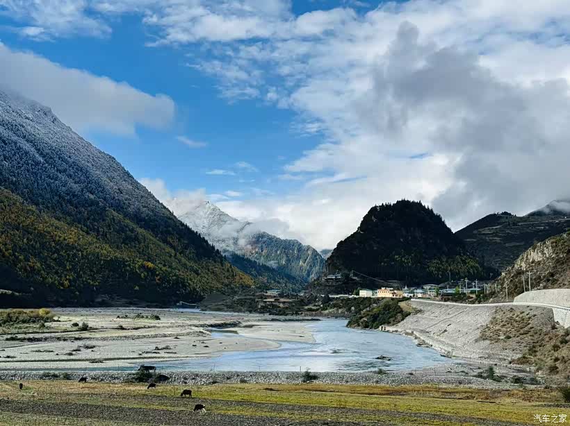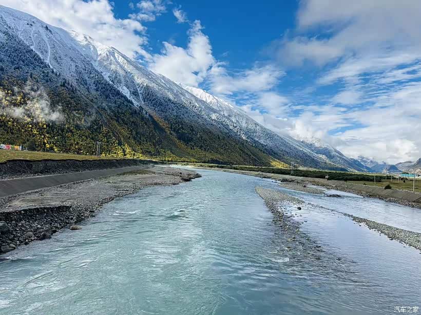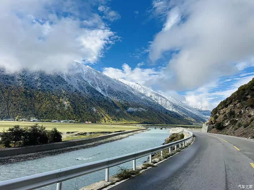 蓝天白云雪山河谷与河流公路,组合成一幅画卷