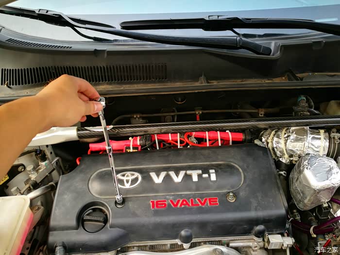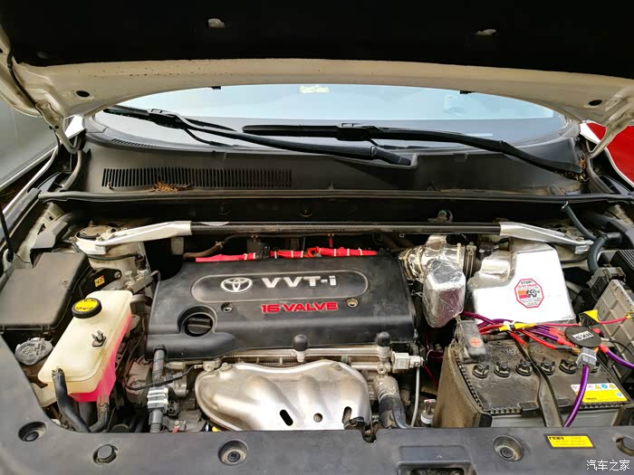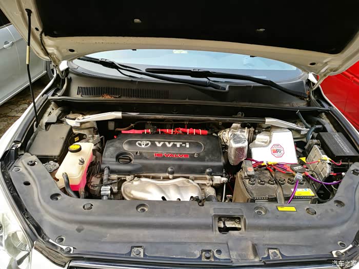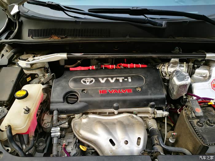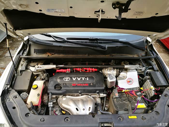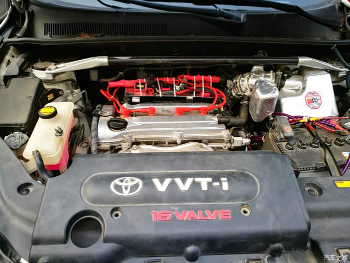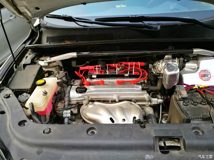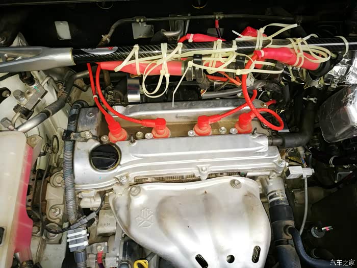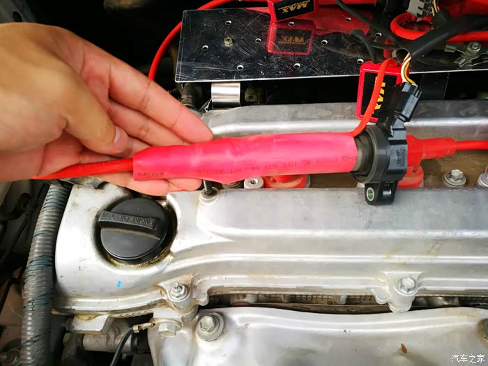 4月份就开始构思一个支撑托盘,以便把点火线圈固定起来。先来介绍一下点火增强器吧,它由一个方形本体和两根电线组成。RAV4车型需要转接火花塞插头才能实现增强器的安装,就是图中红色的线束部分。红色的点火线束插连接火花塞,原车的点火线圈就要找到合适的地方固定起来。这是让我苦恼的问题所在。在没有合适的托盘之前,只能临时用扎带固定在顶吧上。