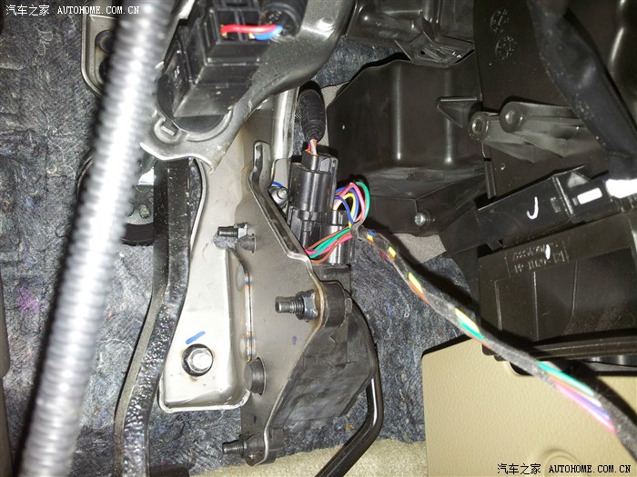 拆掉方向盘下面的装饰板方便走线,全是卡子固定的,直接向着司机座位的方向拔出即可。然后取下后视镜调节开关的线束和OBD接口。都是卡子固定的,找到相应的机关很好取下。巡航系统上带的OBD接口有两个头,一公一母,一个插到原车OBD接口上,另一个固定到原车OBD接口位置取代原车的OBD接口。