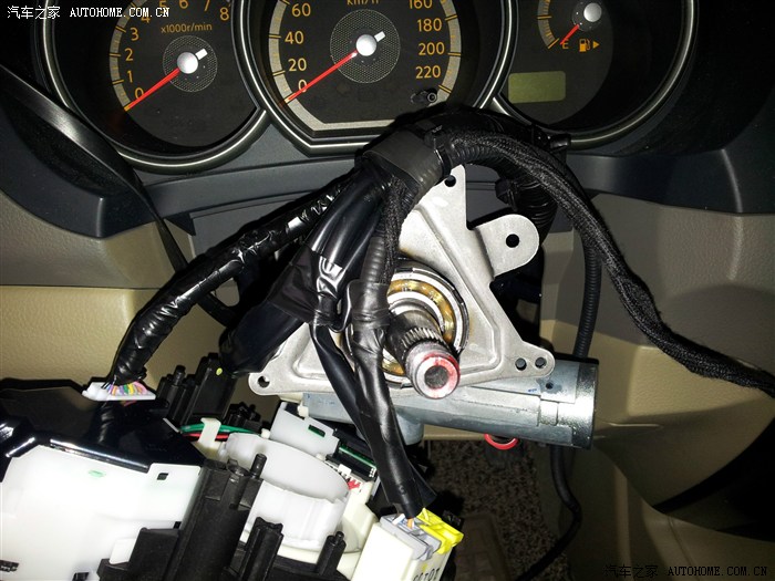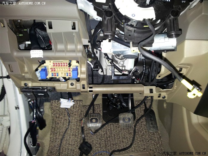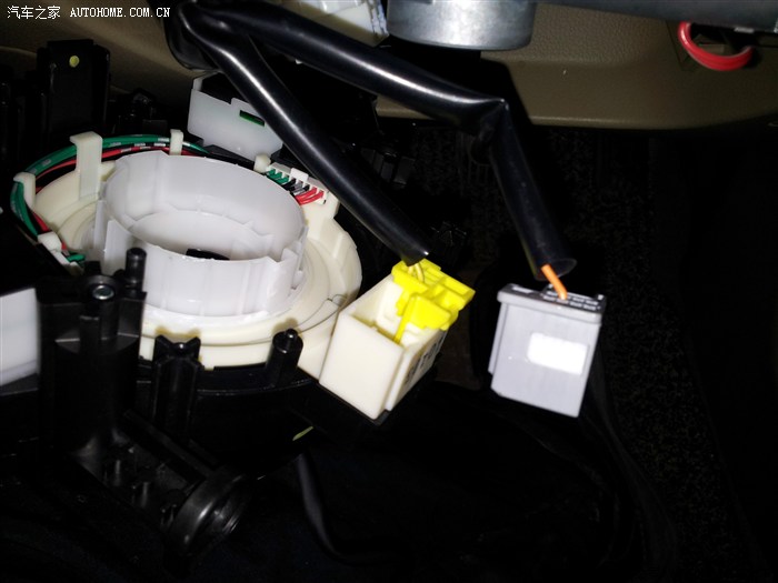 由于是自己边安装边拍照所以进度有点慢,到这个时候都天黑了,剩下的安装图片就没怎么拍了,我尽量文字描述吧,其实这款产品安装最困难的部分就是拆装方向盘的部分,由于我的新款已经是OBD安装的,所以原来比较难的找线,接线部分已经简化到只用找到一个ACC,一个离合器信号线就行了。ACC我直接接到的原车保险盒的收音机位置,反正这个是给防炫目后视镜供电的,对安全没什么影响就能省则省了,搭铁线就近找螺丝。我的车上居然没有离合器开关,所以也就没有什么离合器信号线,当时没办法了,只好翻出说明书,找到厂家技术支持电话,对方让我吧离合器信号线跟巡航控制器上某一根线并接,我猜测那根估计是刹车信号线,去离合器信号主要是为了在巡航行驶中踩离合器解除巡航用的,没有离合器的车在行驶中踩离合器会造成发动机转速突然升高,这是很危险的,我也很好奇行驶中踩离合会怎么样特意验证了一下,下坡的时候没事,上坡的时候,踩离合速度降低后巡航主机马上给油,转速狂飙到5000+幸亏偶也是换过驾照的老司机了,赶紧踩刹车解除了巡航,换了新手肯定慌了。确实很危险,随后看来有必要给我车上再装一个离合器开关了。