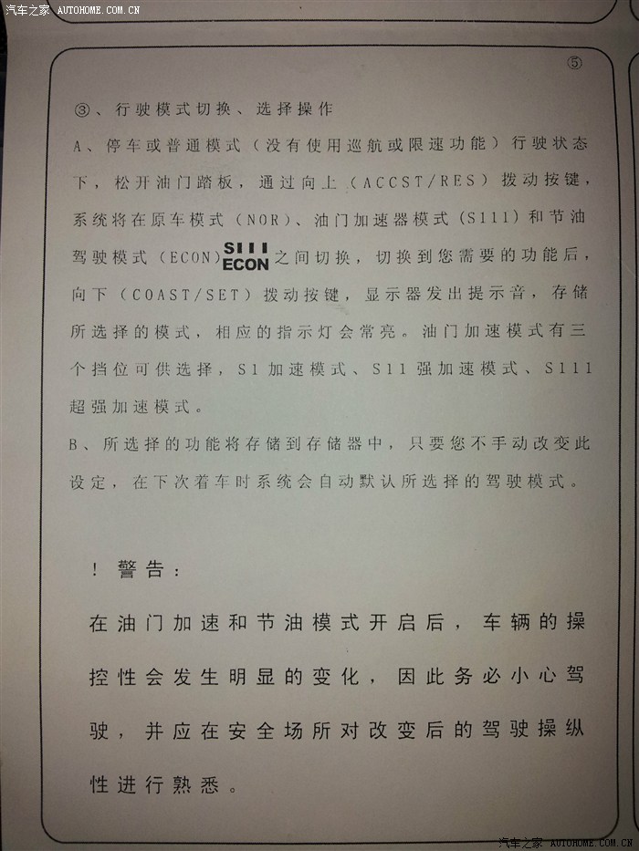 这个模式我仔细体会了一下,原来我一个人开车时油门有点冲,开启后油门变缓了,感觉还是有点冲,不像奔驰或者奥迪上的,油门使劲踩就是不走车。我自重17x斤,今天又带上我一个200斤的兄弟才感觉油门稍稍有点肉了,这比我的预期还是冲了点,希望以后厂家改进一下,把ECON模式也弄出三档可调的。方便大家根据自己情况调节。