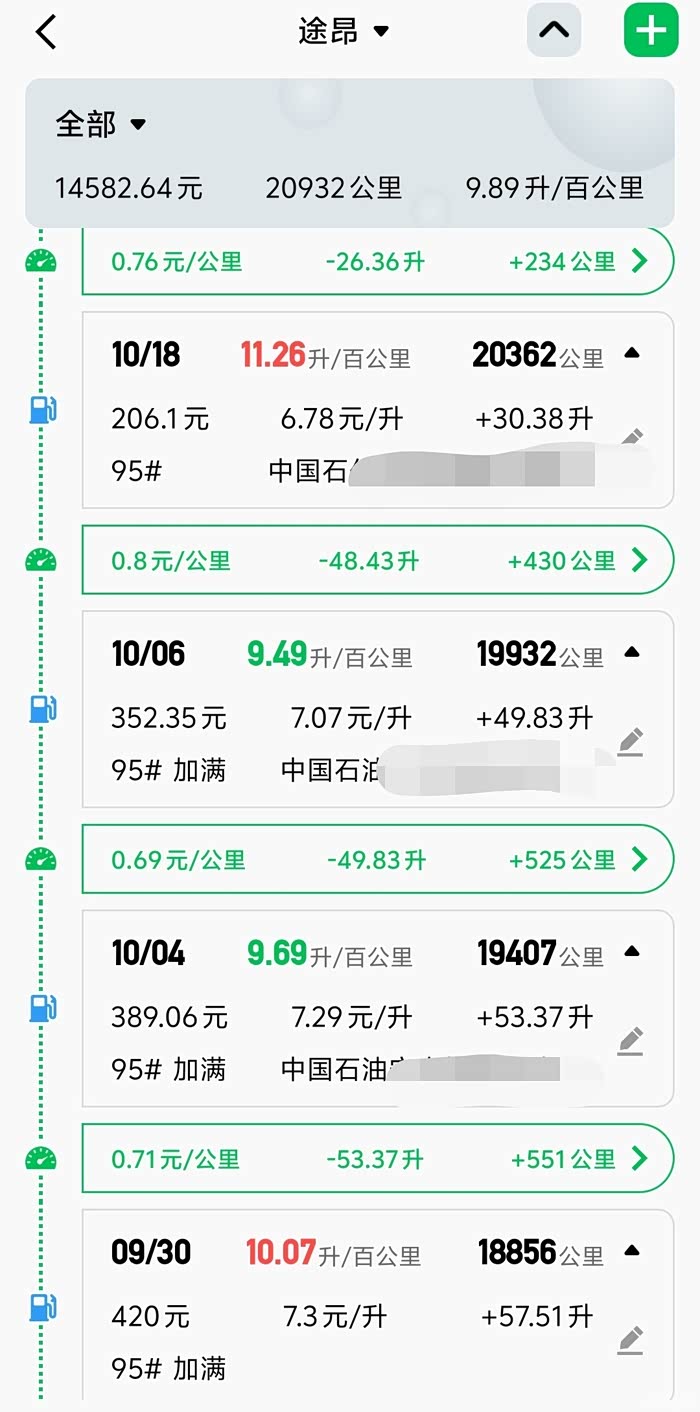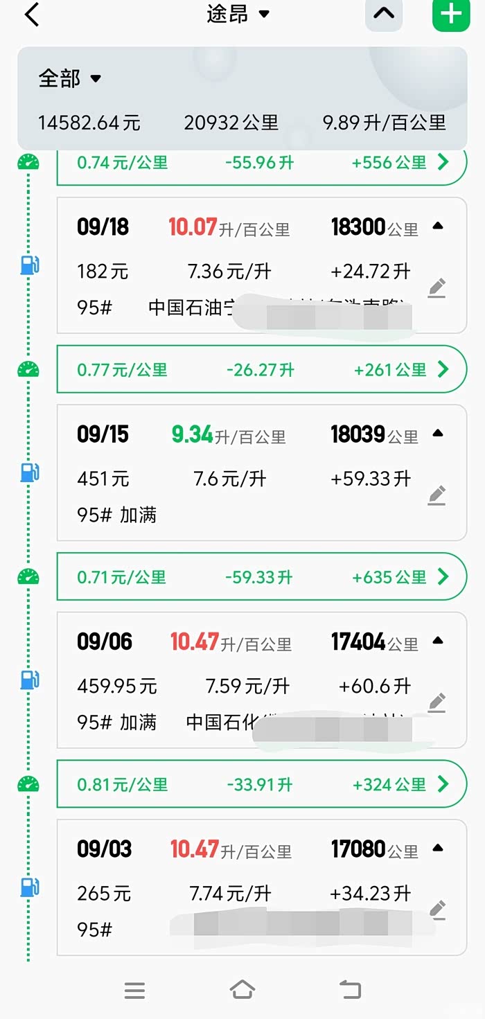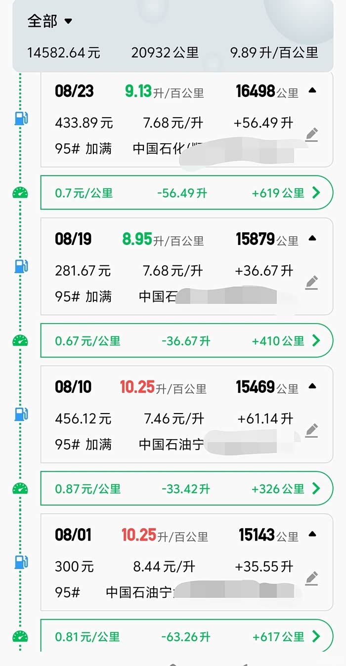 自己通过两次加满油,输入汽油单价、加入总金额、以及当前的公里数,在某APP上计算得到的油耗。8月份的数据