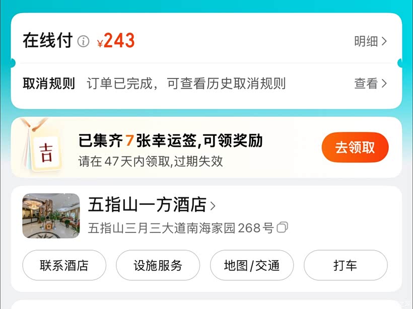 亮点:性价比之王!在五指山市区,离方诺寨和红峡谷漂流都近,房间带阳台,能看到远处的山景。最惊喜的是有免费停车场,车友的车也能停,两天住下来平均每天才120多,太值了。