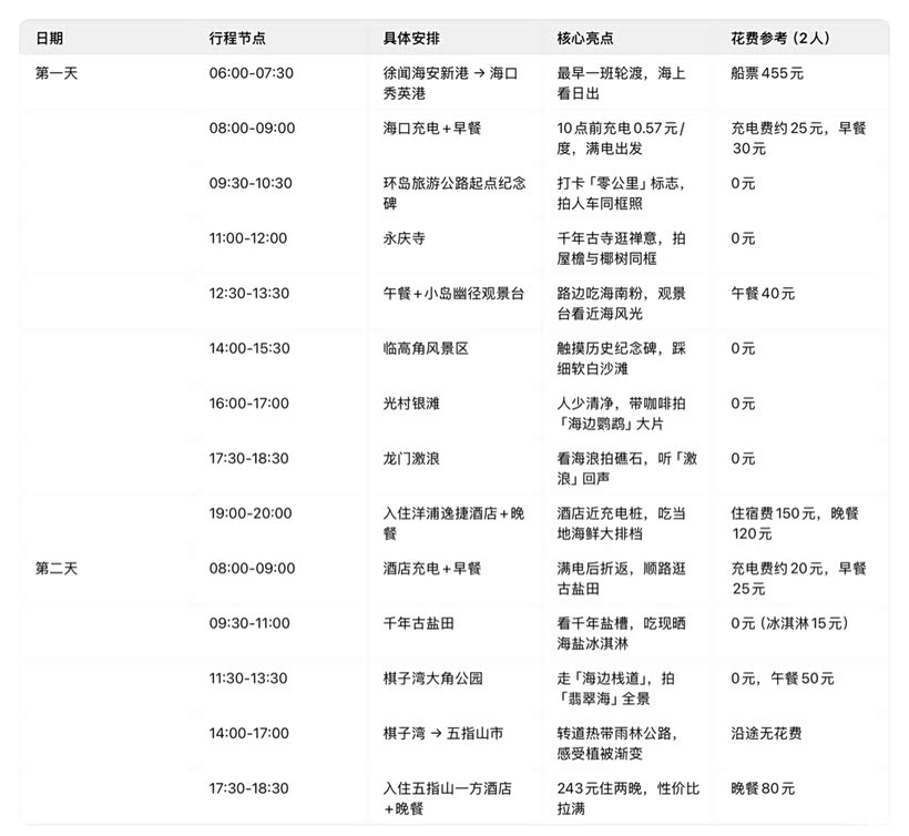 以下是两天行程的详细拆解,关键信息全在表格里: