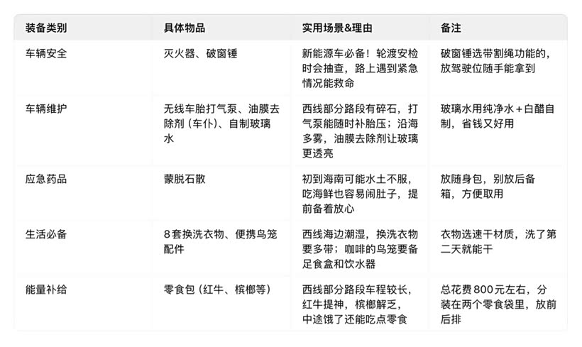 作为新能源车自驾,装备的「实用性」比「花哨」更重要,西线两天跑下来,这些大部分都派上了用场(除了药品),整理成清单给大家参考: