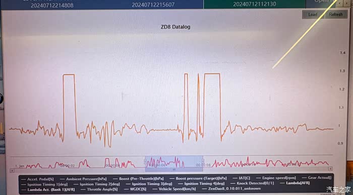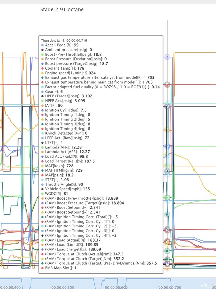 给你看我拉的LOG,6档,5024转,车子135迈,合216公里,这时候没有爆震,但出现了退火,燃油检测质量0.14,对比平时的时候有退步。当然这只是某个时刻的LOG,我看车从0加速到216整个过程log各数值的变化,就知道程序极限在哪里,平时如何控制速度、挡位、转速了。这样拉log才有意义。另外ZD8给的免费数据通道太少,看个大概而已,不过还好这程序不是很激进。