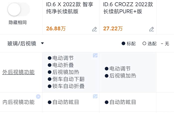 2022款中,上汽大众ID.6X 有外视镜电动折叠、倒车自动下翻、锁车自动折叠等非常实用的功能,我们在狭窄过道,外视镜折叠巧用方便停车和两车交会;倒车下翻可以直视马路牙子,减少轮胎鼓包等的硬伤,两车相会差不起那个30CM的,同款的一汽大众ID6 CROZZ在细节上稍显逊色。