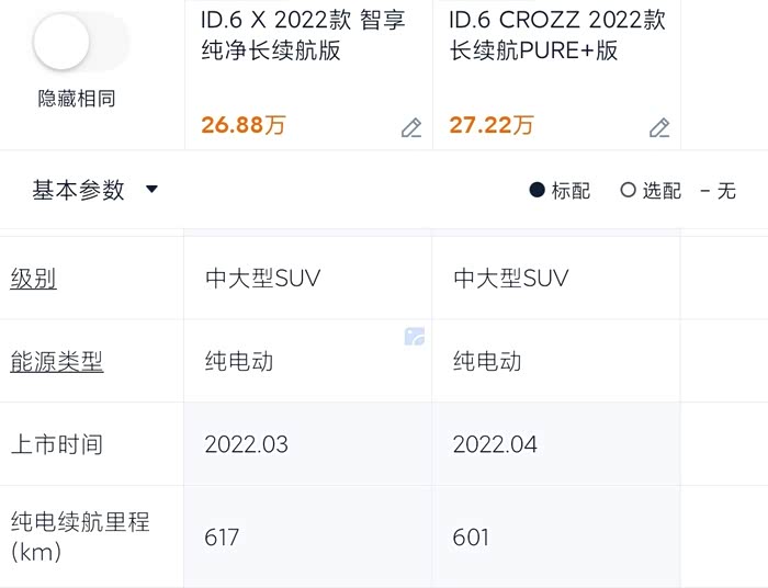 近期,上汽大众2022款ID.6X上市,综合补贴后售价245,288元-335,888元,共提供6款车型。 配置方面,ID.6 X全系标配外后视镜电动折叠、迎宾照地灯、智慧车联系统 4.0 升级版、IQ. Drive智慧驾驶辅助系统,包含交通拥堵辅助系统、ACC自适应巡航系统、Lane Assist车道保持系统、Front Assist前方安全辅助系统等。上汽大众ID.6X智享纯净长续航版与一汽大众ID.6 CROZZ长续航PURE+版,综合补贴后价格分别为26.88万和27.22万,我们就这两个相近的车款,实际对比看下。