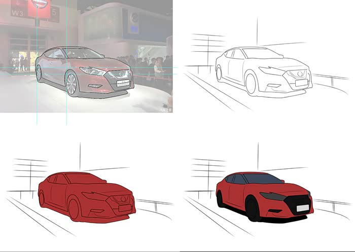 绘制过程在5x有分享,我在这里再和大家细说一下:照片拖入ps,拉低透明度,新建图层后,用钢笔路径描边,把汽车轮廓勾勒出来,在线条图层下新建图层上色,先铺一遍大色块,在用选区工具框选亮部提亮,选中暗部拉低明度,做好整车大体的明暗部以后再修饰细节,轮圈和门把手,挡风玻璃黑色胶条等位置,最后新建图层点几笔白色,用涂抹工具擦一下,擦出那种模糊感。这是我绘制的整个过程,这不算画汽车,这属于描线填色,和真正的画汽车相差十万八千里。