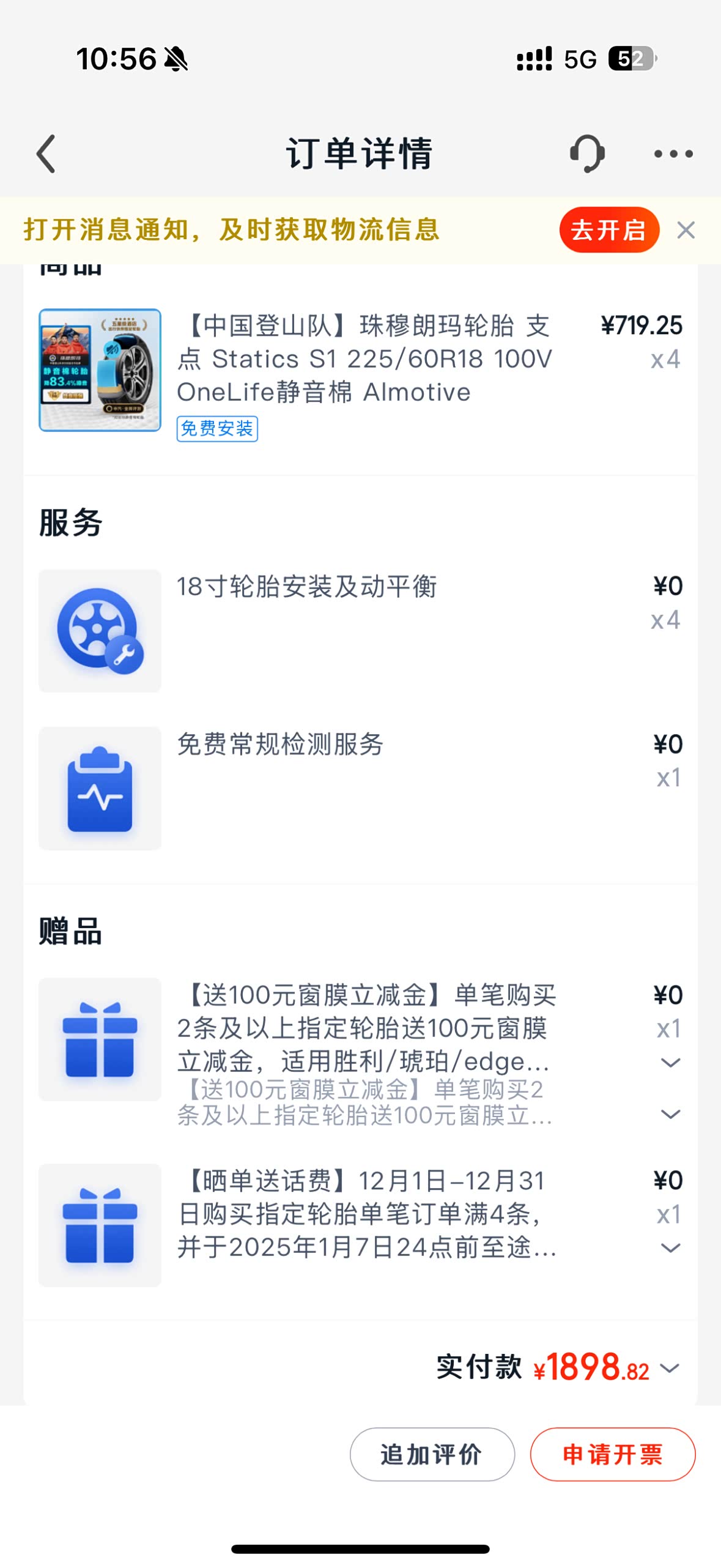第二天轮胎到了,看了一下出厂日期是2024年45周,也就是2024年9月底,算是新胎。