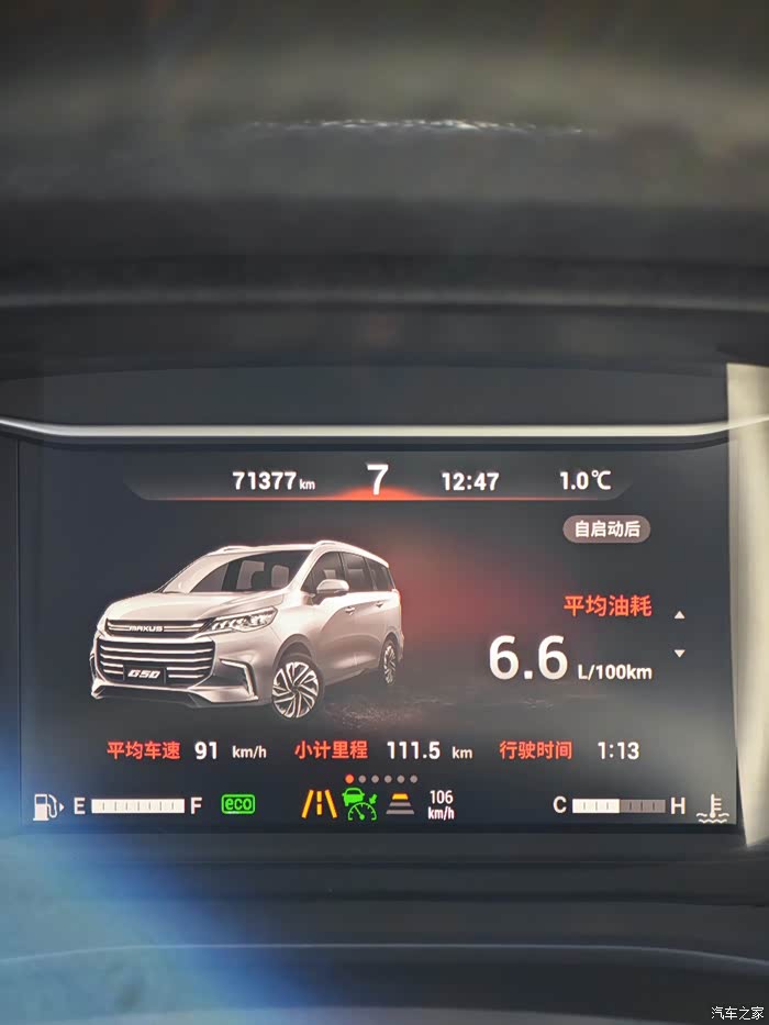 6、能耗表现优秀,精打细算的一把好手。我的老款大通g50的1.5t涡轮增压发动机匹配的是七速干式双离合变速箱,传动效率高,相对于新款的湿式双离合更省油,油耗表现惊喜。非市辖区城区道路日常通勤上班使用,这款车的油耗在8到9之间,开空调增加1个左右。比我的八代迈锐宝低2个油;高架路80公里行驶,最低油耗跑到过5.6l/百公里;高速路况下,平均时速100公里,油耗6左右,平均时速110公里,油耗6.8左右,作为这么大的车子来说,表现优秀。