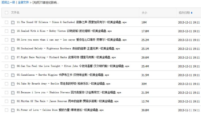 首次分享10G无损APE反响不错,本次重磅再出:72首英文经典。速锐实测可用!文件大小 1.92G