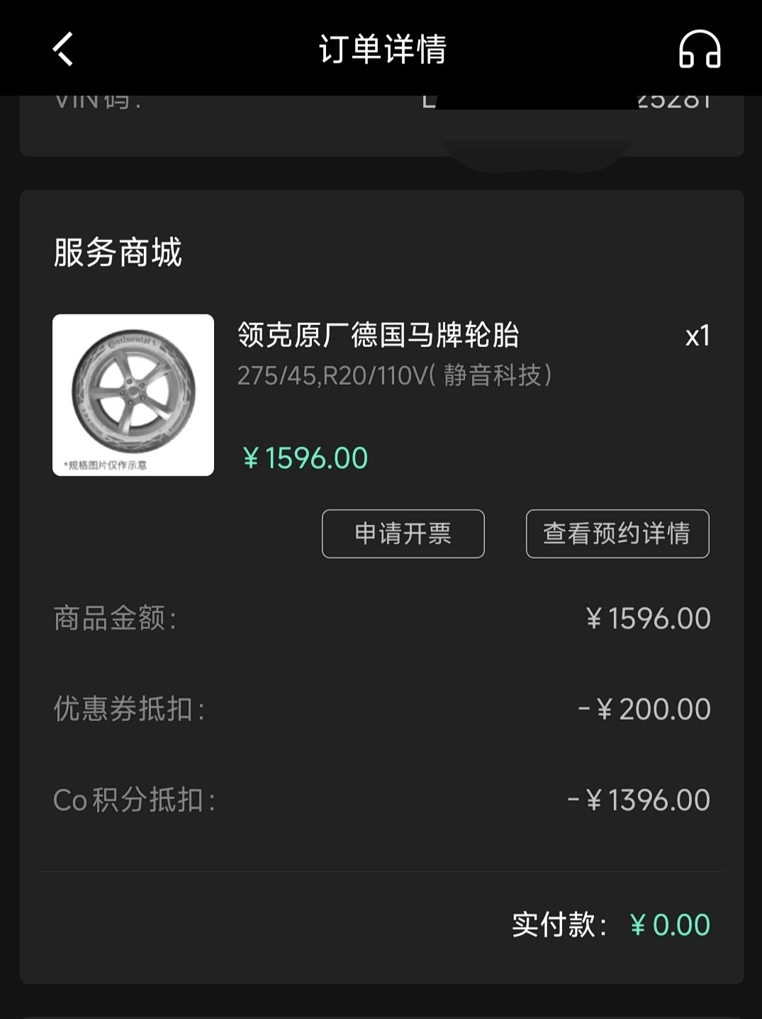 原车用的是马牌的静音胎,275/45R20。单条轮胎市场价都在1500左右,大家都在说它不耐磨,但是我觉得还行,用着挺舒服的。领克商城活动是很给力的,大部分车辆周边配件都可以在商城上买到,也可以用积分兑换,又赶上商城轮胎有活动,每条优惠200元,再用我的积分一抵扣,最后实际付款0元。非常美丽。而且售后工作人员服务的也很好,更换完了还给把车洗了,羊毛又薅上了。