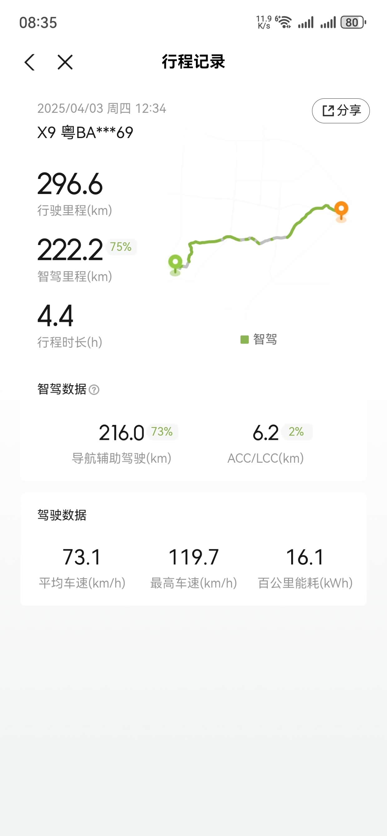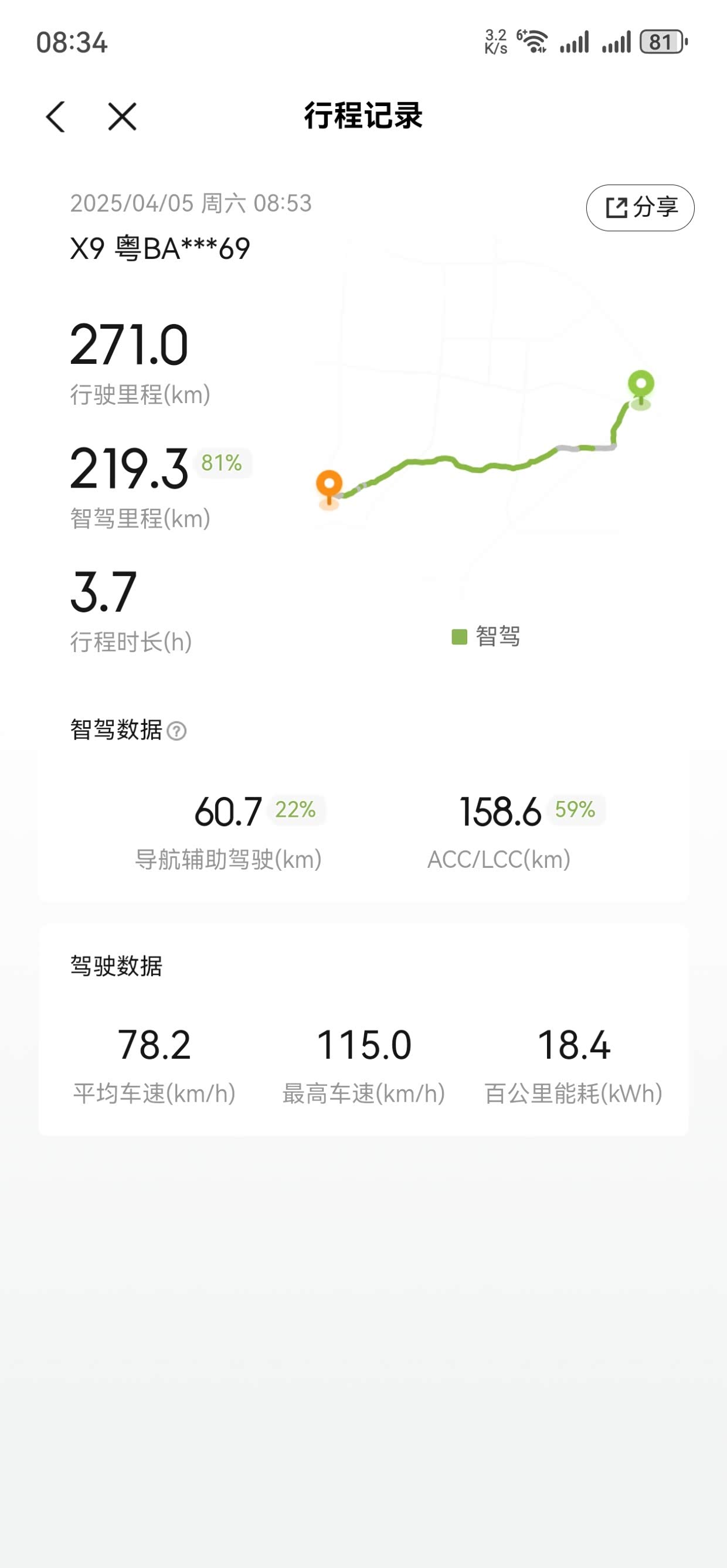 5号凌晨4:30就醒了,干脆直接在高德地图上找了一家3km远的快充站去充电,根据来时的能耗水平,X9在3人乘坐+短途行李情况下,大部分90km~100km智驾高速路况,续航可以达到500km出头左右,这样以后东起汕头西到湛江北到郴州,都可以在它的一次性续航范围内了。