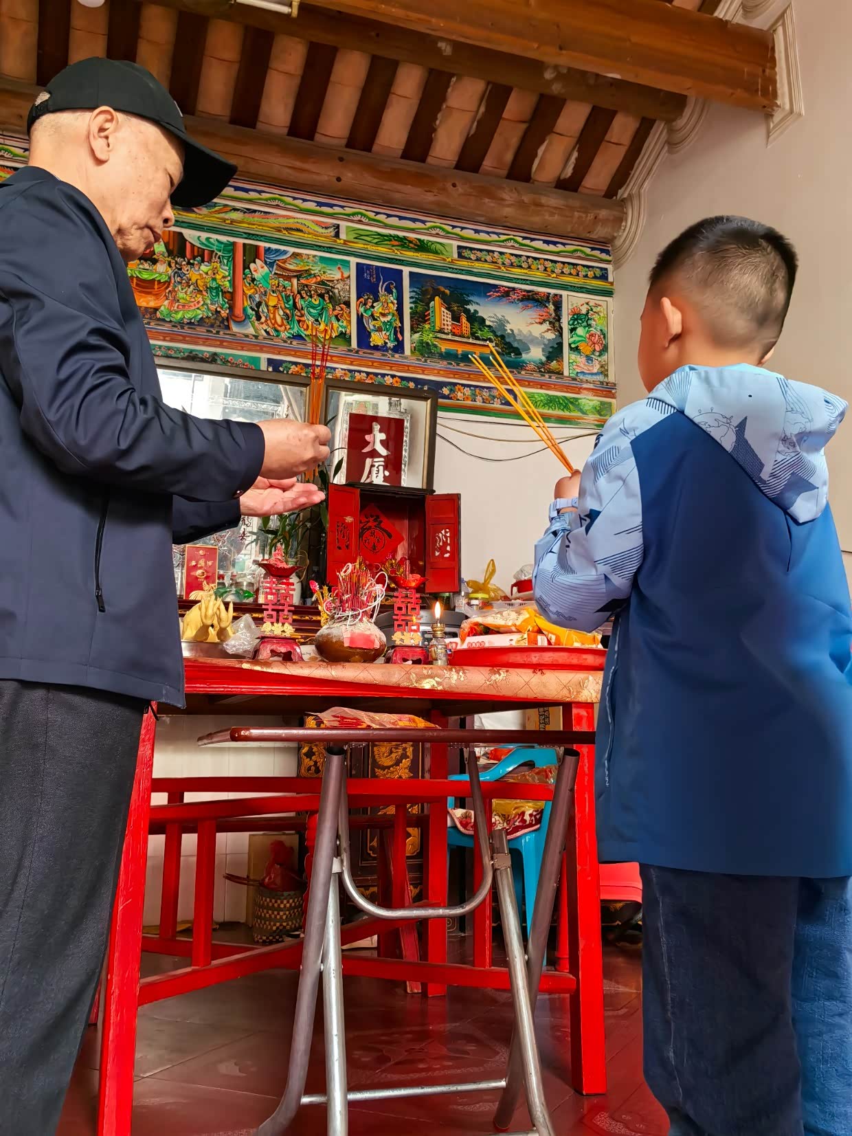 早上8:00,各家各户都在自家堂屋摆上祭拜祖先的香案,焚香祈福