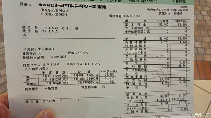 回到了丰田租车中心。这就是你们要的明细~自己看吧~租车本身的成本~