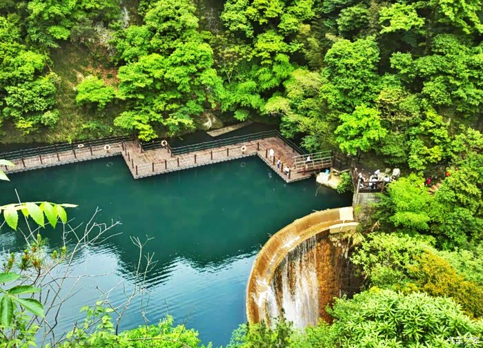 湖边沿的水面上由许多塑料桶、木板、木栅栏搭成了一座长长的浮桥,可以一边在浮桥上行走,一边观赏清澈的湖水和湖边的木屋。下了浮桥,上栈道。在牯牛降景区几乎无路可走。所有的路几乎都是由浮桥、栈道、索桥组成的。祁门牯牛降的栈道都是在山腰上用木板悬空搭建的,行走其上,惬意异常,一点不觉得累,又仿佛在空中云游一般;而那些索桥悬吊在峡谷上空,是游览景区的必经之处。穿行于索桥和栈道之上,观赏峡谷中十步一小瀑、百步一大瀑的美景,感受安徽最原始的森林和植物,心旷神怡,如忘世事。栈道的终点是山涧的一处大水潭,为“仙人聚会”。