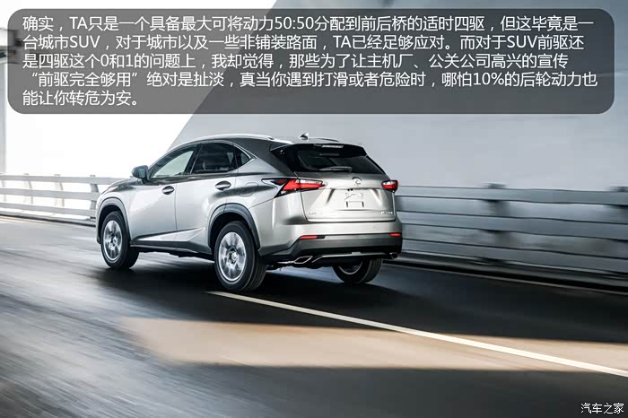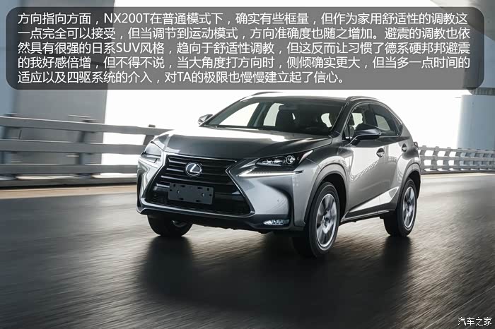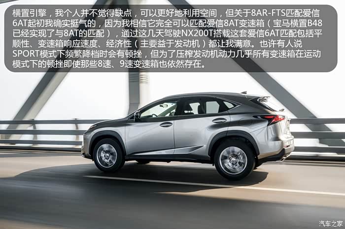 包括奔驰、宝马、奥迪在内的众多品牌都用上了9G-TRONIC / ZF或爱信8AT / 7速双离合变速箱,其实在选择前我也挺气,因为这款横置的8AR-FTS 2.0T涡轮增压发动机完全可以实现与爱信8AT的匹配,但是通过这几天的驾驶,NX200T搭载的这套爱信6AT的匹配,包括平顺性,变速箱相应速度,经济性(主要得益于发动机)都让我满意(包括自己F56 MINI Cooper S上同样搭载的爱信6AT,以及最近试驾过与MINI同UKL平台2系旅行,三厢1系,X1L随比MINI调教好上太多,单在雷克萨斯的这套调教面前,依然相形见绌);